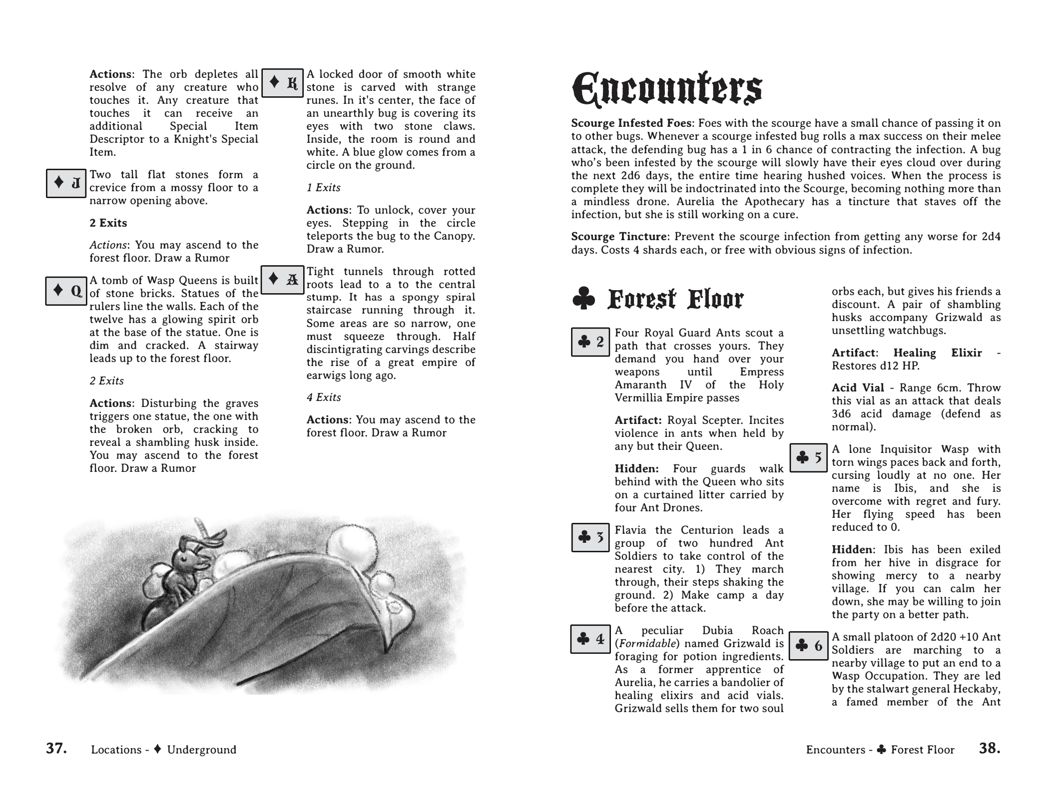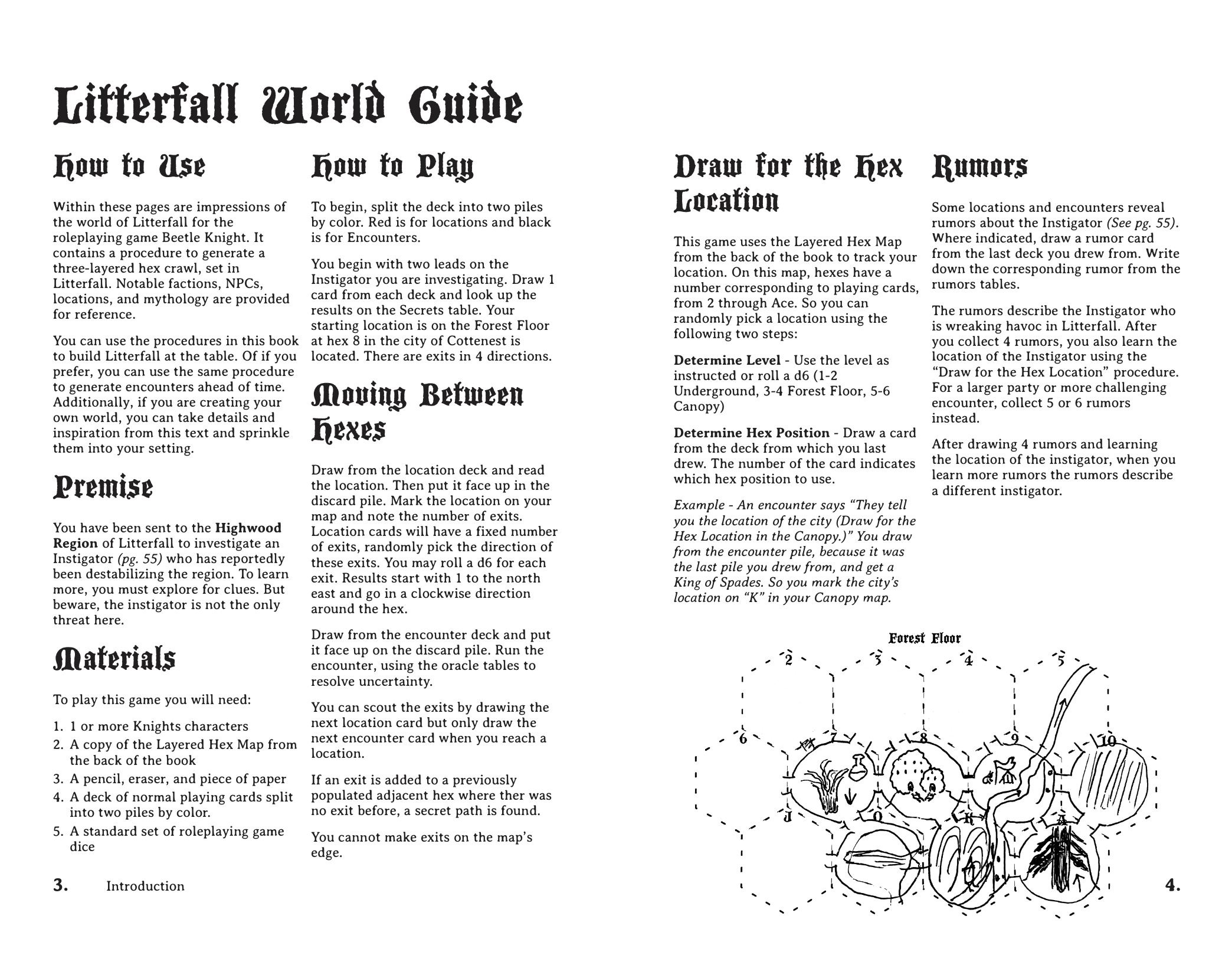 Within these pages are impressions of the world of Litterfall for the role-playing game Beetle Knight. It contains a procedure to generate a three-layered hex crawl, set in Litterfall. Notable factions, NPCs, locations, and mythology are provided for reference.